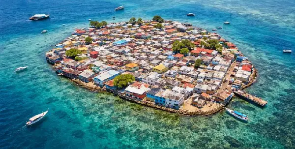En el Caribe colombiano, Santa Cruz del Islote, una diminuta isla artificial de solo 2.4 acres, alberga a más de 800 habitantes, convirtiéndose en la más densamente poblada del mundo. Sin autos